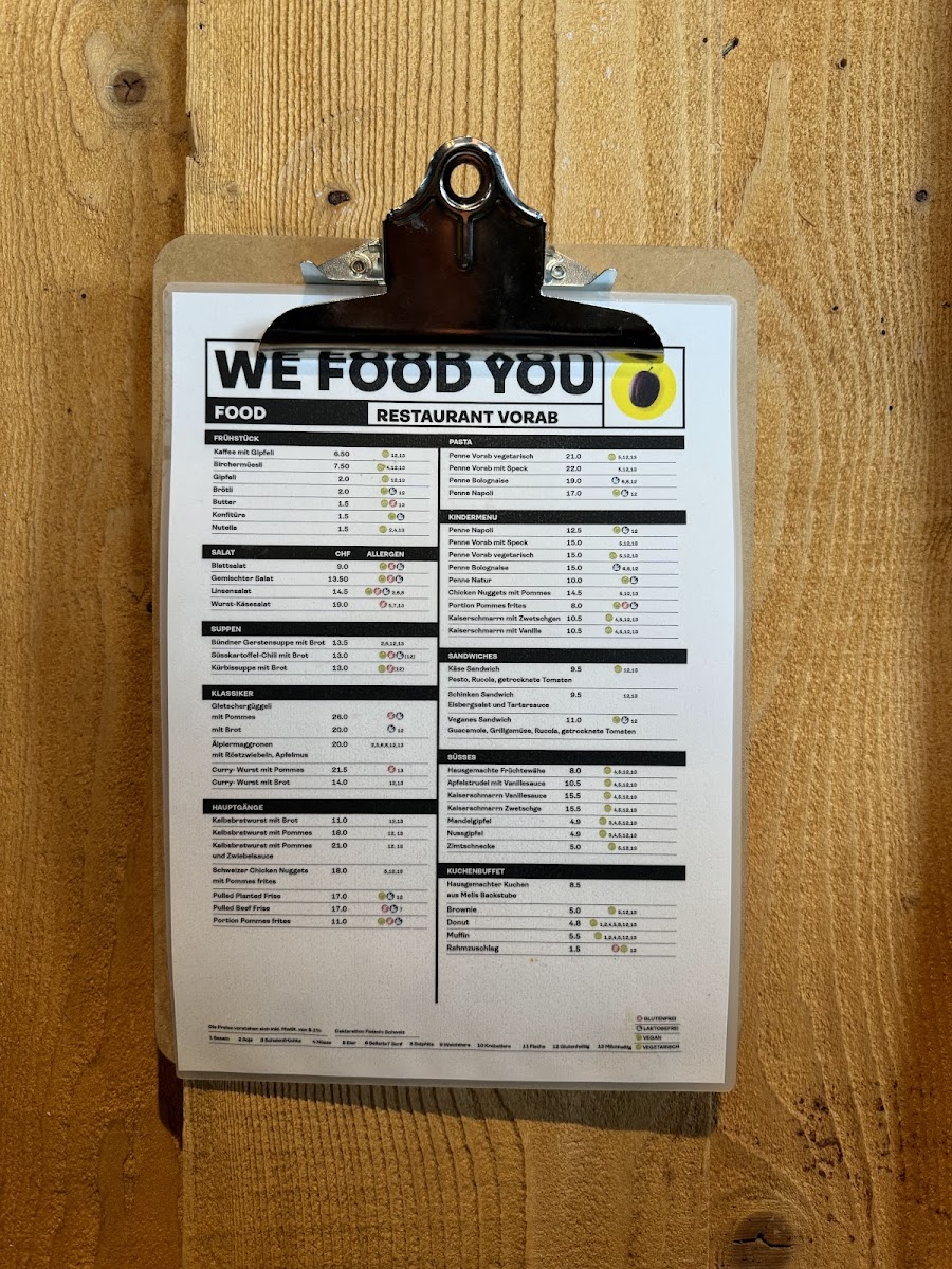 The menu at Vorab Gletscherrestaurant offers a variety of Swiss and international dishes suitable for different meal occasions, including breakfast, light meals, and casual dining. Guests can find a selection of savory main courses, baked goods, and desserts that cater to diverse preferences.