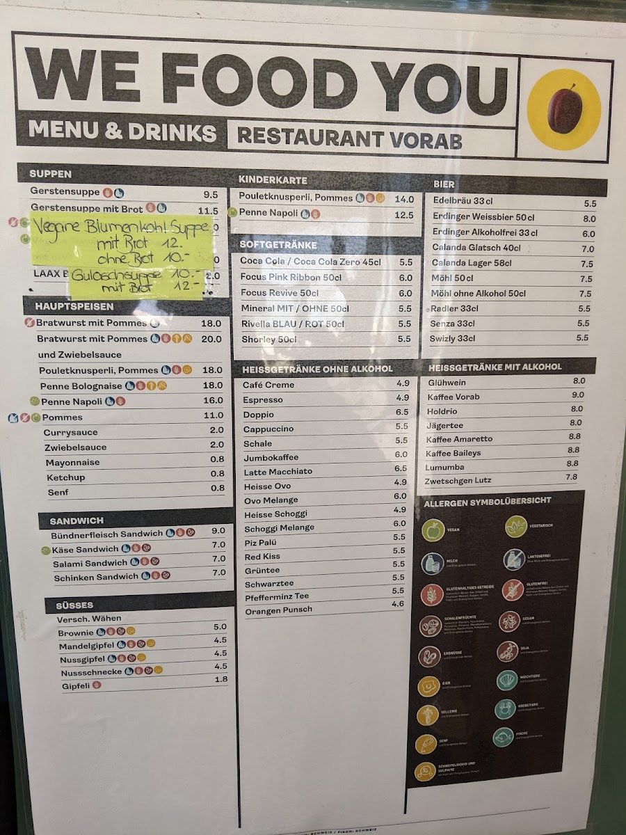 - Main Courses: This includes meat and vegetarian dishes such as Pulled Beef with Fries, Kalbsbratwurst with Pommes and onion sauce, Veggi Poulet with potatoes, Poulet with fried potatoes, Penne Bolognaise, and Ravioli with spinach.